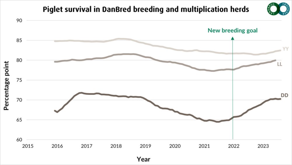 The graph shows piglet survival measured in DanBred’s breeding and multiplication herds for Yorkshire, Landrace and Duroc. After the new trait for piglet survival was introduced into the breeding goal in the summer of 2022, a significant improvement is seen in all three breeds.