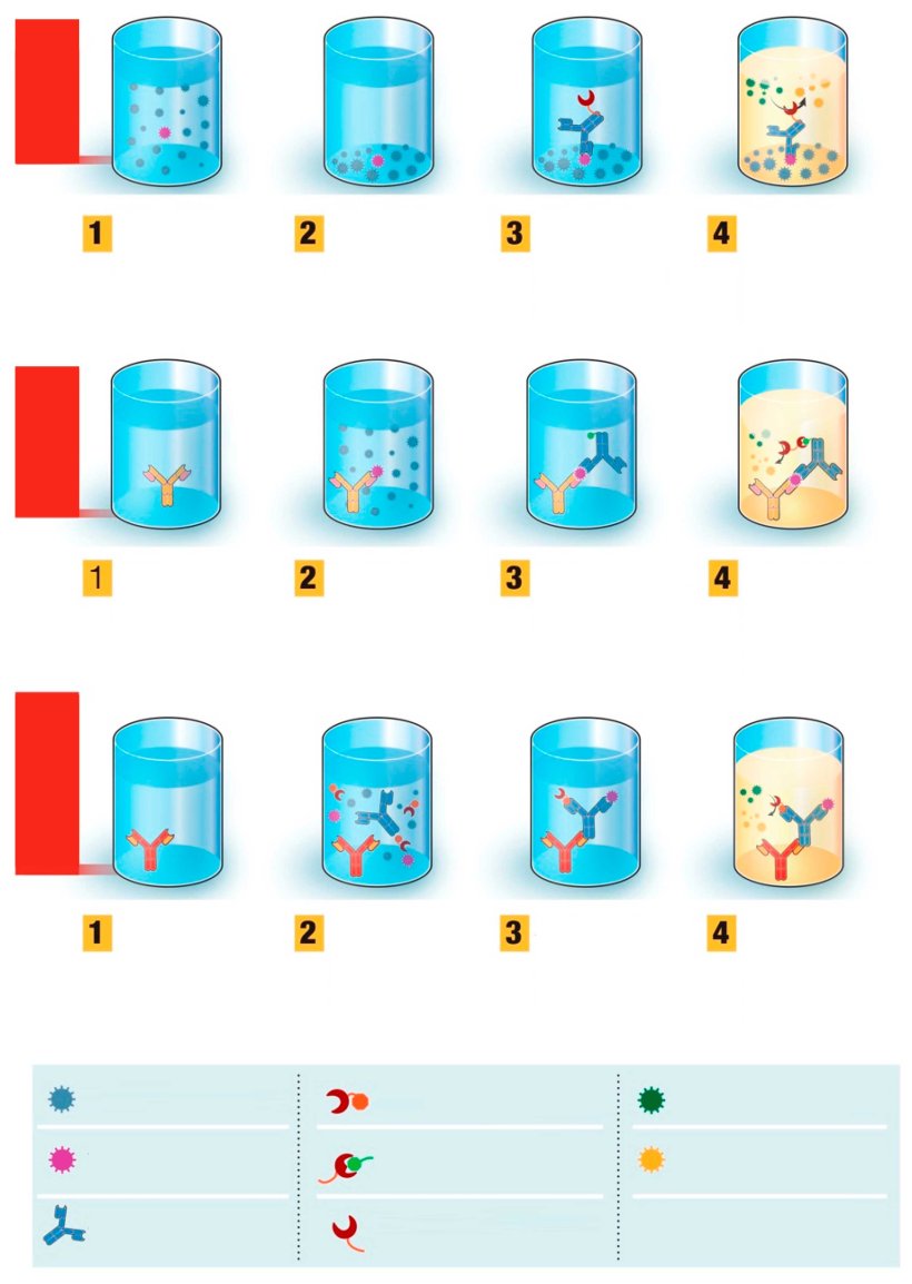 - Passo 3. A amostra é retirada e os anticorpos especiais que se ligarão ao lado oposto dos anticorpos (parte inferior do anticorpo "Y" na detecção de anticorpos) ou antigénios (parte superior do "Y" na detecção de antigénios) são adicionados. A amostra é então incubada para permitir a ligação e lavada para assegurar que anticorpos ou antigénios não ligados (isto é, não alvo) sejam removidos.