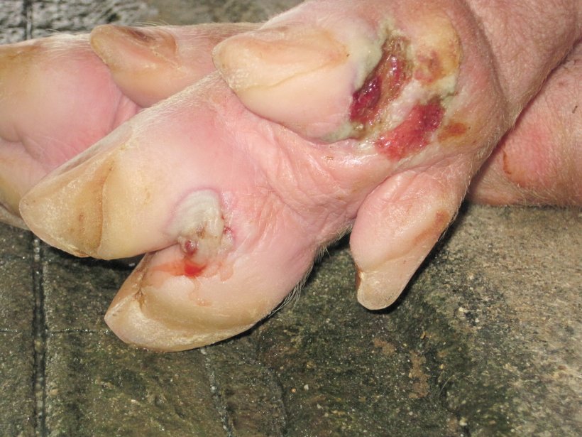 Na engorda, o suinicultor notou que os porcos de todas as salas estavam apáticos e apresentavam coxeiras. Uma inspeção mais profunda indicou que quase todos os porcos apresentavm um grau variável de coxeiras e estavam deitados na maior parte do tempo. Quando eram obrigados a levantar-se, guinchavam, coxeavam um momento e ficavam parados. Os porcos tinham dificuldades para chegar aos comedouros, tinham reduzido muito o seu consumo e estavam a perder condição corporal. Alguns dos porcos pareciam babar-se, com excesso de saliva. Quando se examinaram vários porcos, observaram-se lesões escuras, sanguinolentas e ulcerativas nas patas. Especialmente nas laterais, justamente sobre a unha e, nalguns casos, entre elas. Estas lesões eram mais evidentes quando lavávamos as patas dos animais. Nalguns animais, pareciam mais crónicas e já se estavam a curar por elas mesmas.