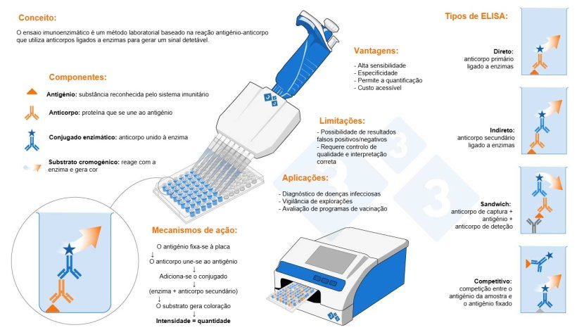 Esta infografia fornece uma visão geral objetiva dos mecanismos de ação, componentes estruturais e principais variantes deste imunoensaio antigénio-anticorpo.