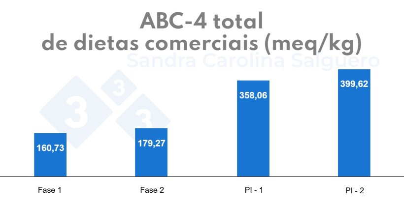 Os valores de ABC-4 variam entre os ingredientes da ração, sendo ricos em minerais como o carbonato de cálcio e o óxido de zinco, bem como em proteínas vegetais, como o bagaço de soja. Warner et al. (2022) demonstraram melhorias no rendimento da produção com a redução de ingredientes que aumentam a ABC-4.