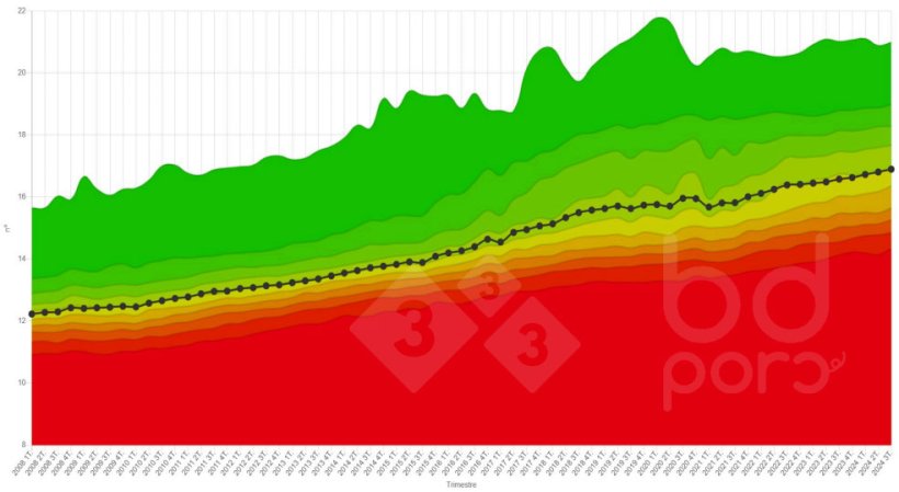Gráfico 1: Evolução dos Nascidos Totais por ninhada na base de dados BDporc desde 2008 até 2024. É apresentada a média e os diferentes percentis. Ver secção Comparador de dados reprodutivos na 3tres3.