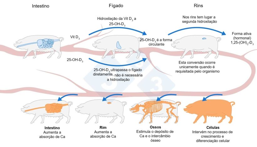 A vitamina D melhora a biodisponibilidade e a digestibilidade do cálcio e do fósforo, participando no metabolismo de ambos os minerais. É sintetizada pela luz solar (indisponível nos animais alojados) e deve ser incorporada na dieta (suplemento vitamínico). A forma habitual de ingestão de vitamina D é a vitamina D3, que, após ingestão e absorção, é hidrolisada no fígado e entra na corrente sanguínea como metabolito circulante 25(OH)D3 (Figura 3).