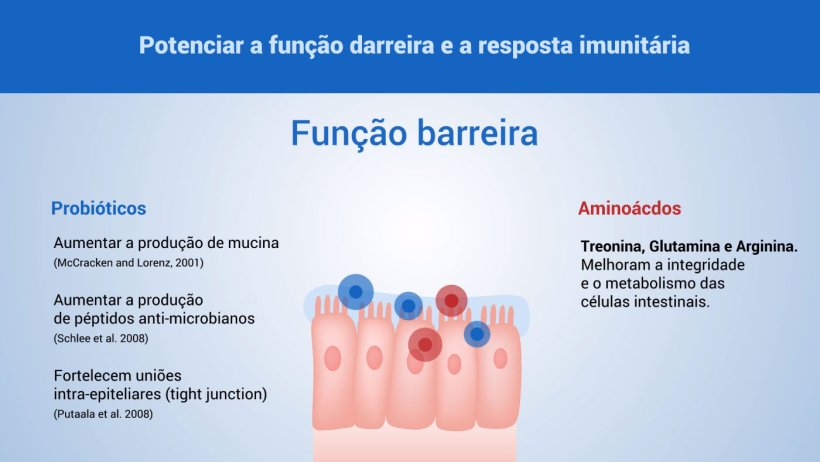 Está descrita a capacidade de determinados microorganismos probióticos para interagir com o epitélio intestinal e melhorar a função barreira através do incremento da expressão de proteínas que formam as uniões estreitas (do inglês tight-junction) (Putaala et al., 2008), o aumento de produção de mucina (McCracken and Lorenz, 2001) e péptidos antimicrobianos como as lisozimas ou as defensinas (Schlee et al., 2008). Por outro lado, também é interessante destacar o papel dos aminoácidos treonina (componente maioritário da mucina), glutamina (combustível das células intestinais que favorece a reparação da morfologia intestinal) e arginina (intervem em importantes ciclos metabólicos). Todos eles têm um papel fundamental na manutenção da integridade intestinal e foi-lhes atribuída a capacidade de melhorar a morfologia intestinal e exercer protecção contra agentes patogénicos (Pérez y Nofrarias, 2008; Ewaschuk et al., 2011; Liu et al., 2008).