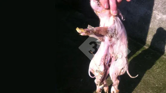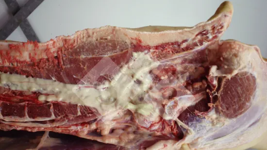 Ao cortar a carcaça a meio é encontrado um abcesso na coluna vertebral, que rebenta. Qual poderá ser a origem?