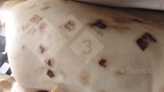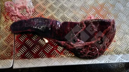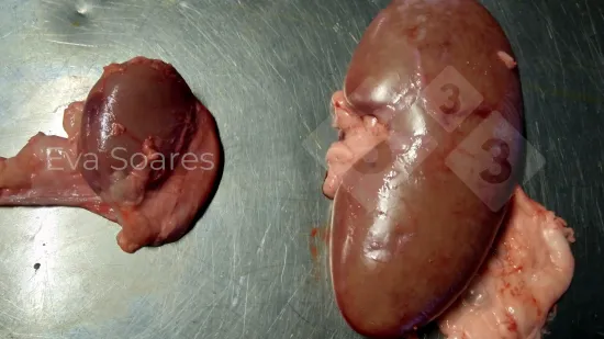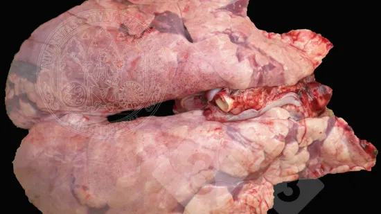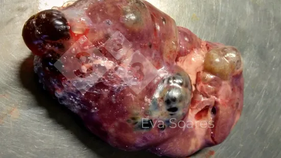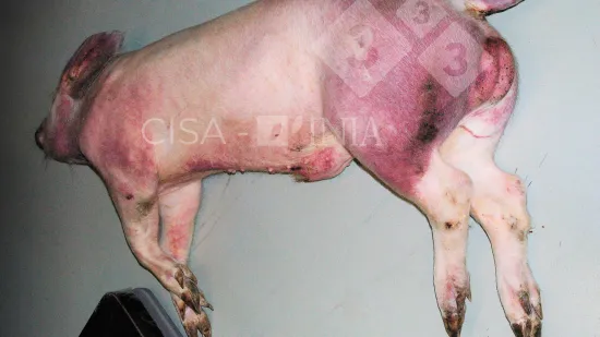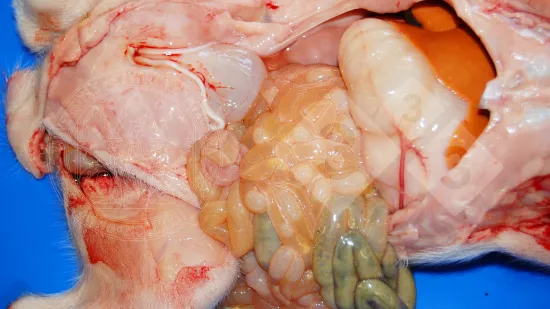 Cólon de um porco das baterias em que a mucosa tem aparência granular de cor amarelada, deixando alguns focos de erosão mais lisos. A nível microscópico corresponde a áreas de necrose da mucosa. Trata-se de uma colite necrótica provocada por Salmonella. Neste processo também pode haver afectação do intestino delgado. Devemos fazer o diagnóstico diferencial com as lesões produzidas pelas Brachyspiras, sobretudo com a B. hyodysenteriae, que apenas afectam o intestino grosso e são mais frequentes em porcos de crescimento e engorda, ainda que também possam afectar animais das baterias.