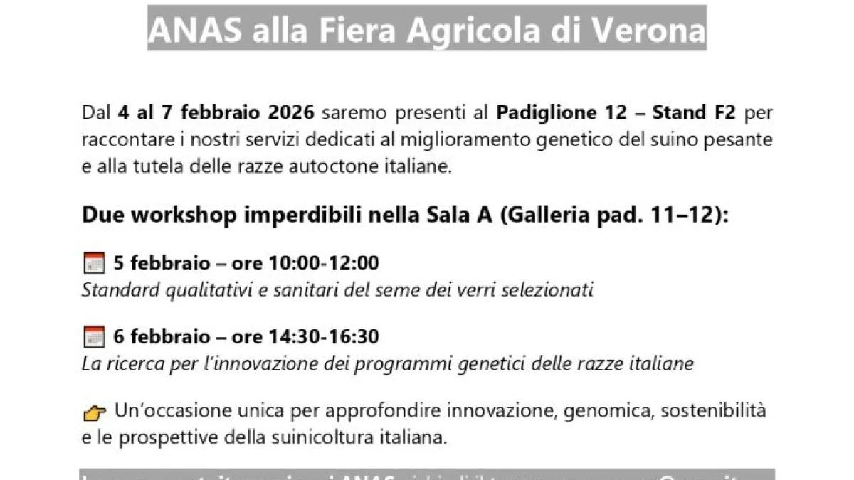 Dal 4 al 7 febbraio 2026 saremo presente al Padiglione 12 Stand F2 per raccontare i nostri servizi dedicati al miglioramento genetico del suino pesante e alla tutela delle razze autoctone italiane