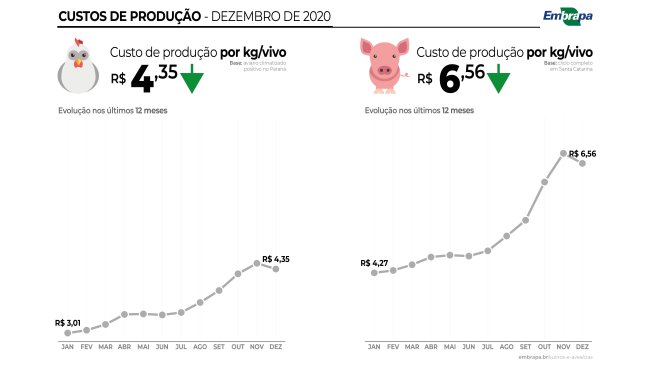 Os custos de produção dos suínos e de frango de abate tiveram aumentos record no ano 2020, segundo a CIAS, Central de Inteligência de Aves e Suínos da Embrapa.