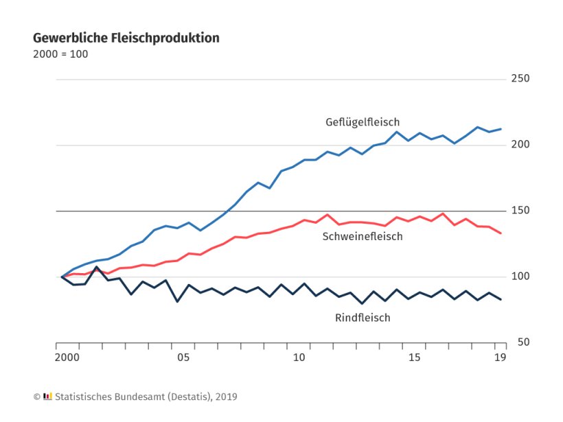 Nos primeiros seis meses de 2019, 29,4 milhões de porcos, vacas, ovelhas, cabras e cavalos foram abatidos em matadouros comerciais na Alemanha. Incluindo aves, os matadouros produziram 3,9 milhões de toneladas de carne.