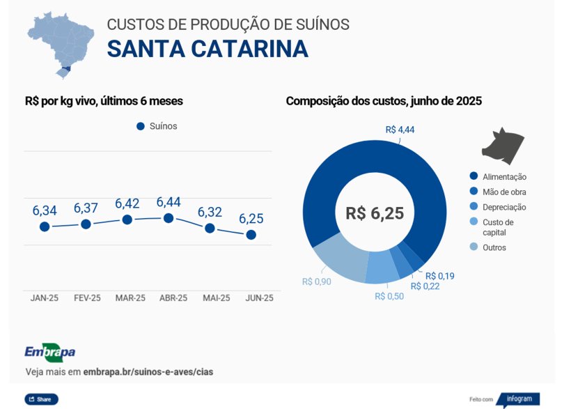 Em Santa Catarina, o custo de produção do quilo do suíno vivo recuou para o menor valor do ano: R$ 6,25, o que representa uma redução de 1,13% em relação a Maio. No entanto, o ICPSuíno (Índice de Custos de Produção de Suínos) ainda acumula alta de 0,74% no ano de 2025 e de 7,07% nos últimos 12 meses, atingindo 357,70 pontos em Junho.