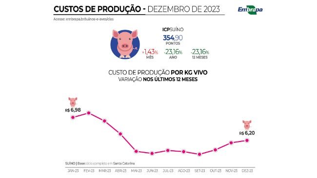 O quadro geral em 2023 foi de queda no preço da ração e de estabilidade dos demais preços, porém em patamares elevados, excepto por um certo alívio na energia elétrica e pelo aumento nos salários. Os preços recebidos pelo quilo do porco vivo também apresentam tendência de recomposição na maioria dos países. Por isso, o pesquisador aponta para uma perspectiva de ampliação das oportunidades para as exportações brasileiras, no próximo ano.
