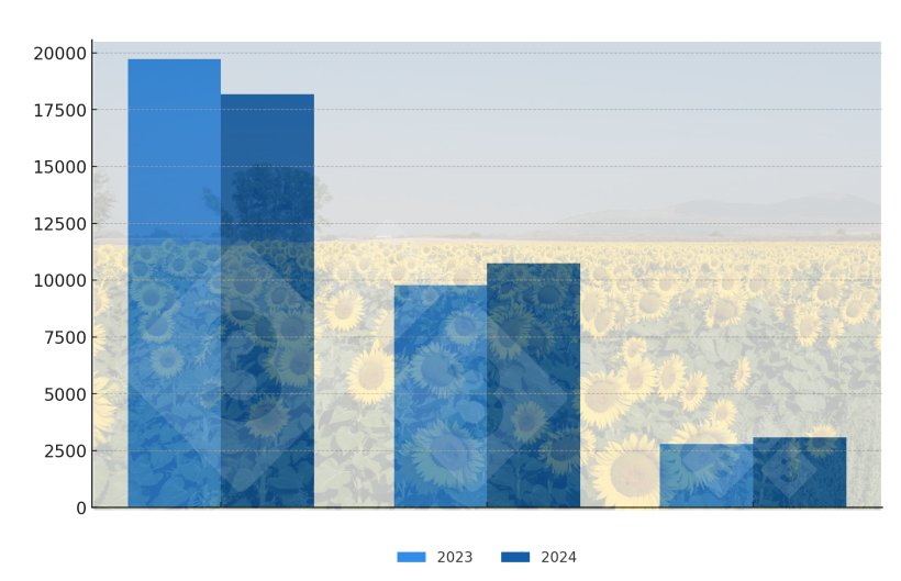 Ao contrário da colza, a área semeada com girassol deverá aumentar 1,7%, atingindo 4764,4 mil hectares em 2024. Além disso, prevê-se um aumento da produtividade de 7,9%, o que resultaria num aumento significativo da produção de 9,7%, atingindo as 10734,5 mil toneladas.