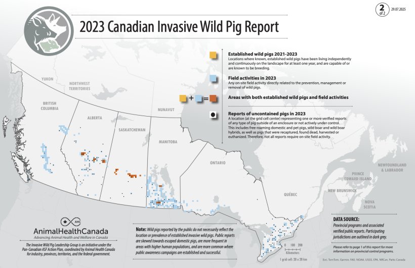 Os programas de controlo de javalis de Colúmbia Britânica, Alberta, Saskatchewan, Manitoba e Ontário contribuíram com dados para o relatório, coordenado pela Animal Health Canada.