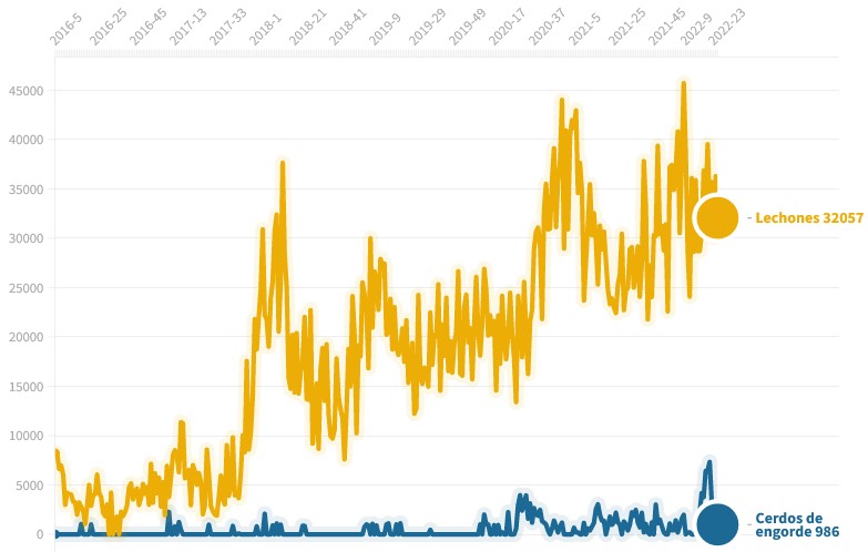 Em relação às importações de leitões, estas aumentaram novamente em comparação com o mesmo período do ano passado. Durante estes primeiros seis meses, Espanha importou 858.966 leitões, enquanto entre Janeiro e Junho de 2021 estes totalizaram 795.000 leitões.