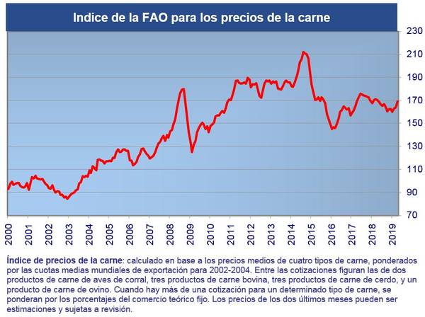 O índice de preço da carne da FAO registou uma média de pouco mais que 169 pontos em Abril, isto é, 4,9 pontos (3,0%) a mais do que em Março, em particular devido aos aumentos mensais nas cotações das carnes de porco e de vaca e, mais moderadamente, das carnes de aves e ovinos.