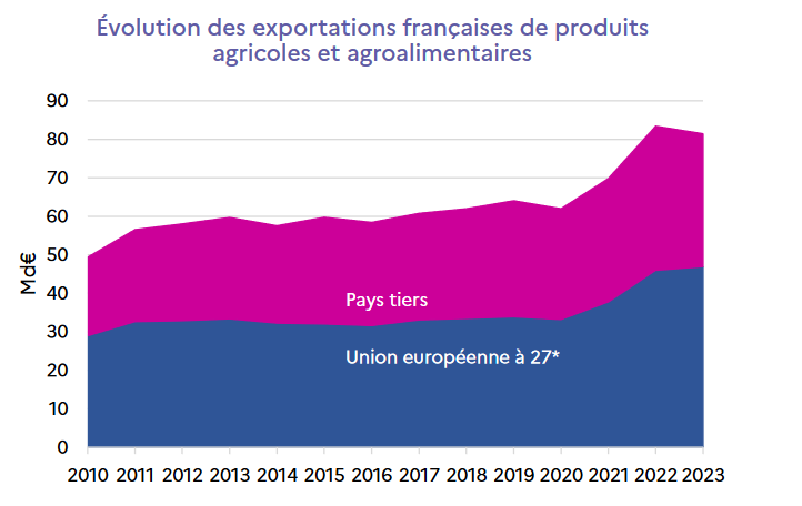 Desde 2020, a França tem sido o sexto maior exportador mundial de produtos agrícolas e agroalimentares, com uma quota de mercado estável de 4,4% em 2023.
