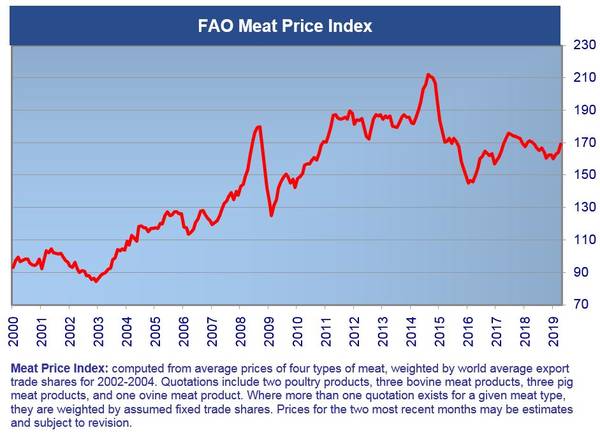 O índice de preço da carne da FAO ficou em uma média de 170,2 pontos em Maio, o que representa um aumento marginal desde Abril. A tendência de aumentos modestos de preços mensais observados desde o início do ano é assim mantida. Em Maio, os preços da carne suína continuaram a subir devido à forte procura por importações, especialmente do leste da Ásia, que se deve principalmente a uma queda na produção associada à propagação da Peste Suína Africana na região. Os preços da carne de ovino também foram reforçados pela solidez da procura de importações, apesar do volume recorde de exportações procedentes da Oceânia, enquanto os preços da carne de frango permaneceram estáveis devido às condições de mercado equilibradas. Pelo contrário, os preços da carne bovina caíram em relação aos máximos registados em Abril, como resultado da oferta abundante para exportação em todo o mundo.