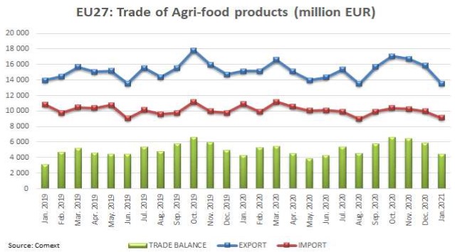 Em Janeiro de 2021, as exportações agro-alimentares da UE diminuíram 11% em comparação com Janeiro de 2020, atingindo um valor total de 13500 milhões de euros. As importações atingiram um valor de 9100 milhões de euros, menos 16% que em Janeiro de 2020, esta descida acontece após um período prolongado de aumento contínuo das exportações. Este facto deu lugar a um superávit comercial agro-alimentar de 4400 milhões de euros em Janeiro de 2021, o que representa um aumento de 3,6% em comparação a Janeiro de 2020.
