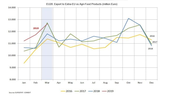 O valor mensal das exportações agro-alimentares da UE, em Abril de 2019, atingiu 12.600 milhões de euros, 12,5% mais do que em Abril de 2018 e apenas ligeiramente abaixo dos níveis recordes de Março de 2018.