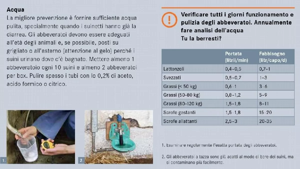 La qualità dell'acqua può essere distinta in due categorie, vale a dire la qualità dell'acqua microbica e chimica. Queste due caratteristiche sono comunque strettamente collegate l'una all'altra. La qualità microbica dell'acqua è determinata dall'organismo vivente. Sebbene l'acqua del rubinetto contenga un basso numero di batteri, la pressione microbica sul capezzolo della bevanda può essere enormemente elevata attraverso un sistema idrico contaminato. Attraverso il sistema di acqua potabile, gli organismi patogeni sono eccellenti nel trasportare un'infezione da animale a animale. La portata della qualità microbica nell'acqua potabile va oltre la sola acqua, è molto importante che anche il sistema di tubazioni sia pulito. La qualità chimica comprende molecole come ferro, manganese, calcio e magnesio, in cui gli ultimi due determinano in gran parte la durezza dell'acqua. Troppi minerali causano precipitazioni nei tubi che possono causare perdite. La precipitazione è anche un terreno ideale per i microrganismi che formano il biofilm. Due minerali che meritano un'attenzione particolare sono il ferro e il manganese. Il ferro da solo, in concentrazioni normali, non è dannoso per i maiali da consumare tramite acqua potabile. Può tuttavia depositarsi all'interno delle linee dell'acqua per la presenza di ossigeno, in cui il ferro solubile si converte in ferro insolubile. Il colore dell'acqua è principalmente causato dalla presenza di ferro. Anche il manganese non è dannoso per il maiale nelle concentrazioni in cui è normalmente presente nell'acqua. Può causare sedimenti neri nelle linee d'acqua, specialmente quando il flusso d'acqua è basso. Elevati livelli di ferro e manganese possono causare differenze nel sapore dell'acqua e possono causare disturbi del tratto gastrointestinale. Si depositerà sulla parete interna delle linee d'acqua, creando un ambiente adatto per l'attaccamento dei microbi e successivamente la formazione di biofilm, ovvero una comunità strutturata di microrganismi racchiusi in una matrice polimerica autoprodotta che è attaccata ad una superficie. Il biofilm può danneggiare l'attrezzatura dell'acqua, dare odore e sapore sgradevole all'acqua e può diffondere malattie attraverso la mandria.