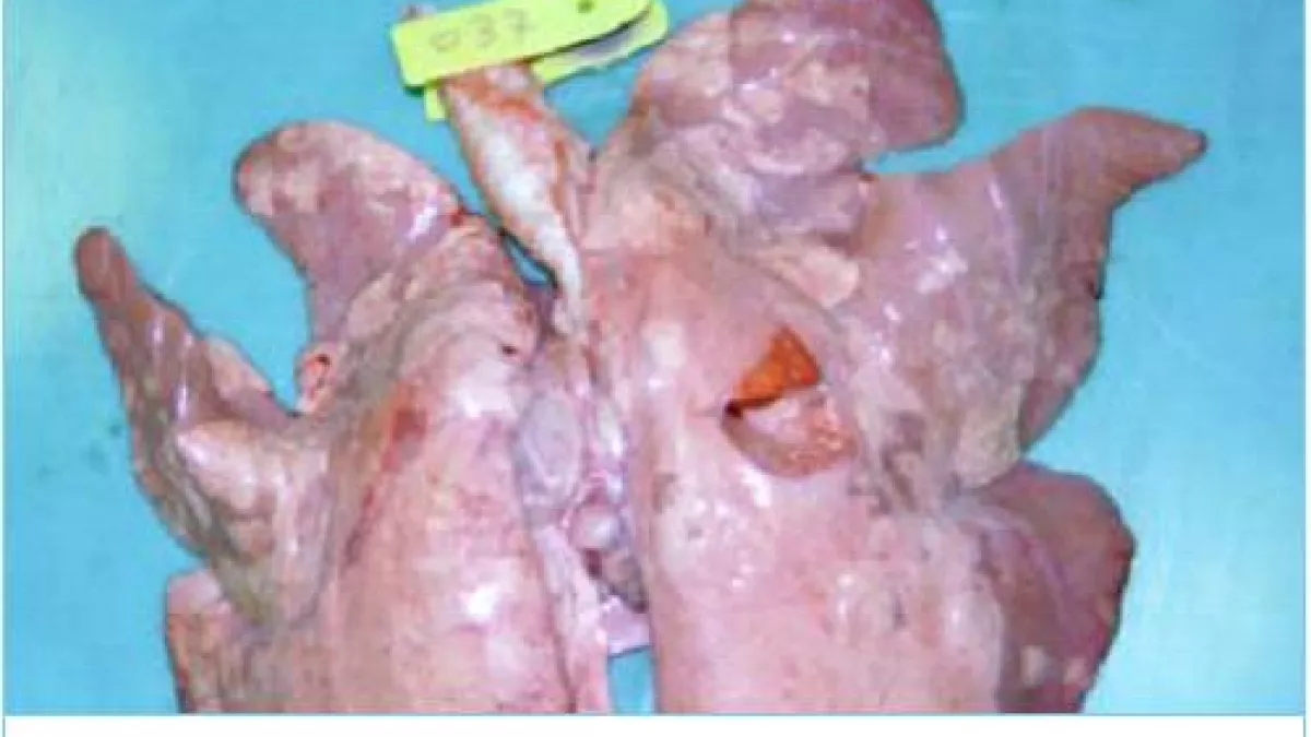 L'infezione da Mycoplasma Hyopneumoniae è ampiamente diffusa in tutte le aree di allevamento suino dell'Ue. Sebbene in diversi Paesi vengano allevati gruppi di suini liberi da Mycoplasma Hyopneumoniae, un'elevata percentuale di animali è colpita in modo endemico.Il sintomo clinico più frequentemente osservato è una tosse cronica non produttiva, che compare circa 2 settimane dopo l'infezione sperimentale, sebbene questo periodo possa essere molto variabile nelle infezioni sul campo. Nella seguente figura sono illustrate le lesioni macroscopiche.