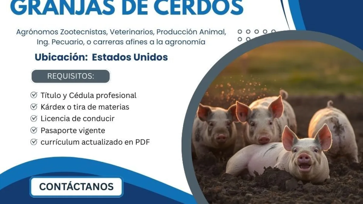 ¡Canadá tiene una oportunidad para ti en la industria porcina!Si eres un profesional en Medicina Veterinaria, Agronomía o Zootecnia, esta es tu oportunidad para conseguir un empleo estable y con potencial de crecimiento en un país líder. Te ofrecemos la posibilidad de obtener una posición de liderazgo y un salario competitivo.