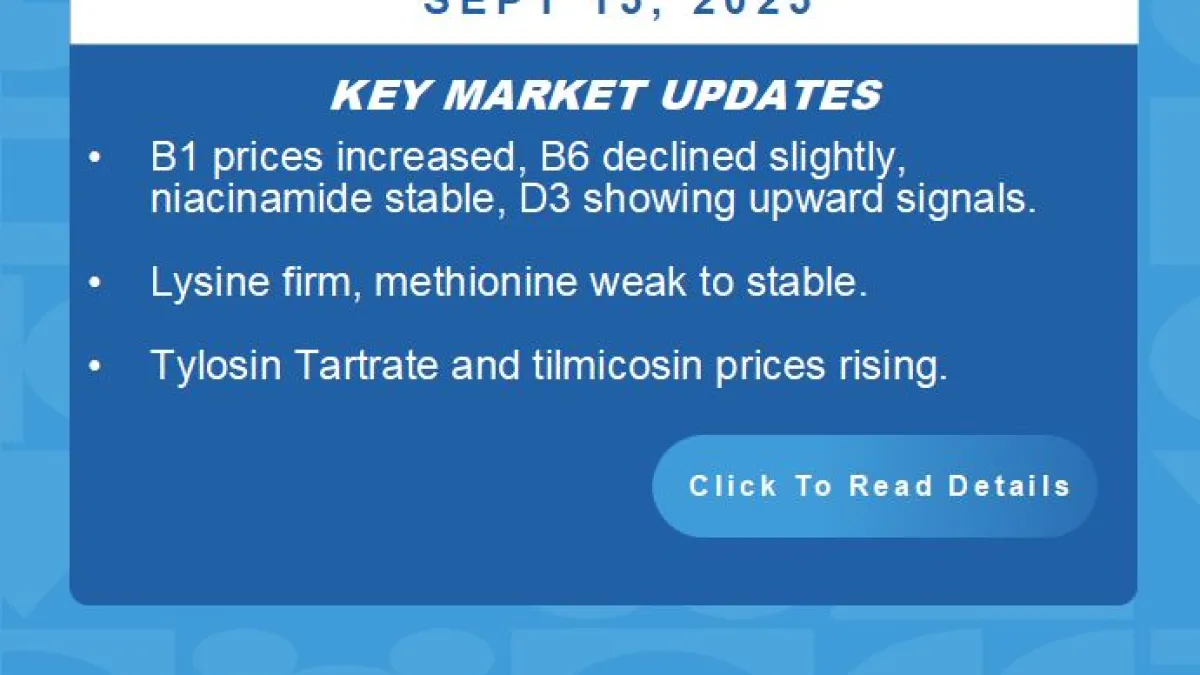 Vitamins: B1 up, B6 down slightly, Niacinamide stable, D3 shows upward signals Amino acids: Lysine firm, Methionine weak to stable