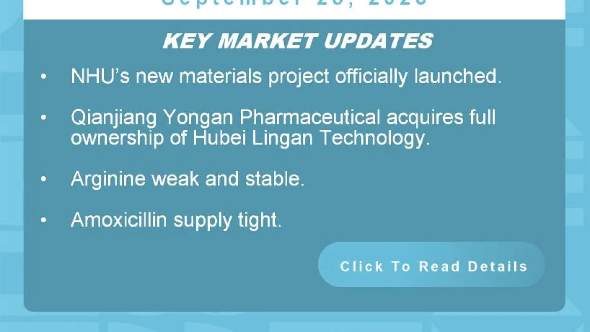 Amid weak demand, Vitamin B1 held steady, while minor amino acids like valine, tryptophan, and arginine lingered at low levels.  Meanwhile, NHU raised cystine prices as facility upgrades continue, and China is preparing revised GMP standards for health foods, signaling tighter quality control ahead.